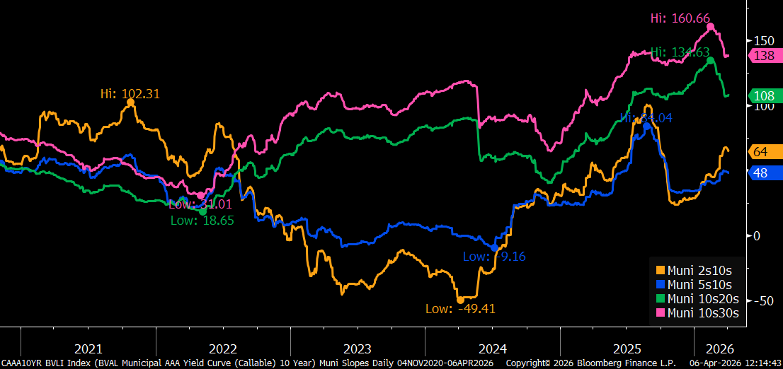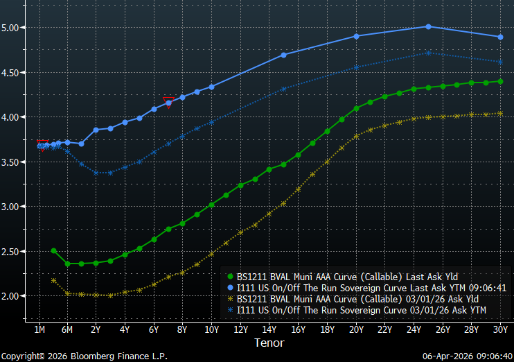 Over the past week, both munis and Treasuries have generally sold-off with Treasuries outperforming as munis catch-up. Since the outbreak of the war in the Middle East, munis and Treasuries have sold-off by roughly 30 to 40 bps for maturities longer than 20-years. The largest moves in Treasuries have not been around the policy sensitive 2-4 year maturities, where Treasuries have sold-off roughly 45 bps. However, municipals have experienced their biggest moves around the 8 to 14-year maturities where they have sold-off by close to 50 bps from February 28, at the beginning of the war with Iran.