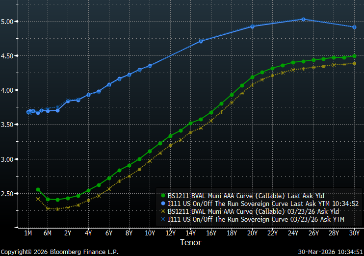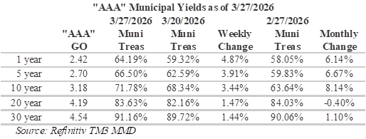 This week, a combination of a more modest new issue calendar and $19.7 billion in maturing principal and interest coming due on April 1, should conspire to create a more favorable environment for munis. Notable deals include: Black Belt Energy Gas District, which plans to sell $1 billion; East Bay municipal Utility District is scheduled to sell $694.3 million, and the Michigan State Housing Development Authority is expected to sell $568 million. According to LSEG Lipper Global Fund Flows, investors pulled roughly $600 million from municipal bond funds last week. Long-term funds reportedly saw outflows of $905 million and high-yield funds saw outflows of $606 million while intermediate-maturity funds received $193 million. Considering recent developments in muni/Treasury ratios, it should come as no surprise that the majority of inflows are going to intermediate funds.