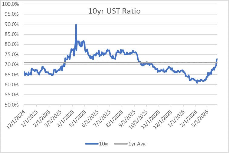 This morning we were welcomed by green screens as Treasuries advanced following weeks of selling. Nevertheless, Day-to-day volatility remains high in the fixed income markets with the war in the Middle East continuing to dominate headlines and what the media is referring to as the biggest oil supply shock in history. The war is now in its second month and the rate cuts investors have been anticipating over the past year are appearing increasingly less likely. Not surprisingly, pricing in the Fed funds futures market has fluctuated dramatically over this past week with current pricing indicating only the chance of a cut over the next year.