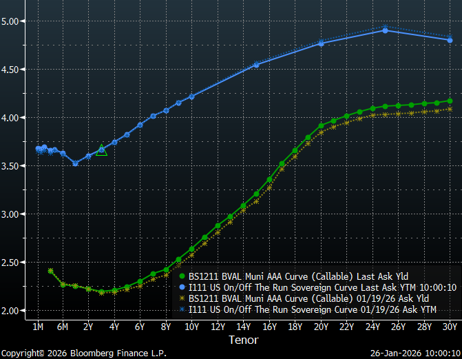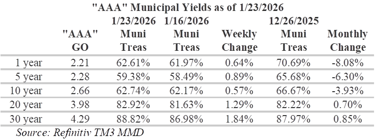 Early last week, international events came into focus following instability in the Japanese bond market. Yields surged in the Japanese bond market following a pitch by Japanese Prime Minister Sanae Takaichi to cut taxes on food, which markets interpreted to mean increased government bond issuance. The result was 40-year Japanese yields jumping to the highest level of any maturity of the nation’s sovereign debt in more than three decades. In addition, escalating tensions over the control of Greenland with the threat of tariffs on European goods added to the melee. The municipal bond market responded to the uncertainty with bonds selling-off. As of the end of the day on Tuesday, MMD ultimately cut yields from 2bps in 2027-28 to 7 bps in 2041-56.