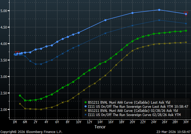 Over the past week, both munis and Treasuries have generally sold-off with Treasuries outperforming as munis catch-up. Since the outbreak of the war in the Middle East, munis and Treasuries have sold-off by roughly 30 to 40 bps for maturities longer than 20-years. The largest moves in Treasuries have not been around the policy sensitive 2-4 year maturities, where Treasuries have sold-off roughly 45 bps. However, municipals have experienced their biggest moves around the 8 to 14-year maturities where they have sold-off by close to 50 bps from February 28, at the beginning of the war with Iran.